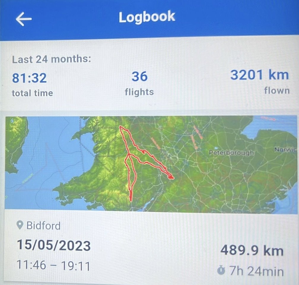 Jordan, one of our soloists, tried for a Diamond Distance on Sunday. It was a valiant attempt falling just short of the distance but a great result given the weather. He returned 7.5 hours later with just 1,000’ spare for landing at Bidford airfield.